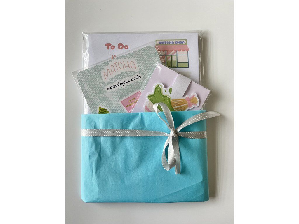 Stylový dárkový balíček s papírenskými produkty pro milovníky matcha.