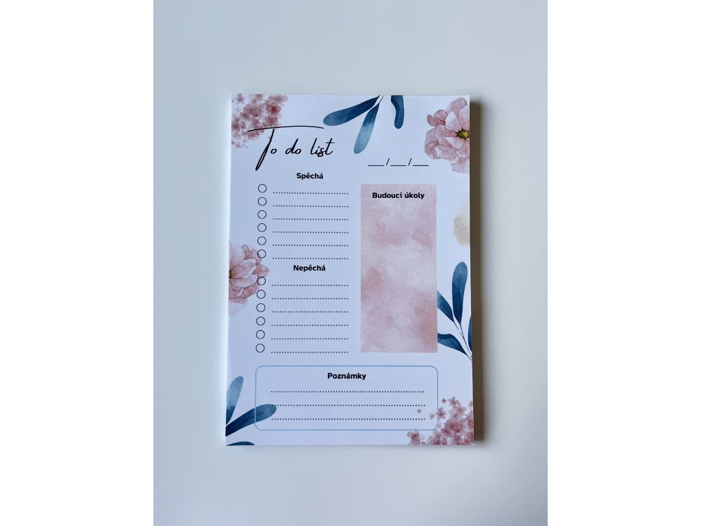 Ručně vyráběný To Do list s jemným květinovým designem ve formátu A5.